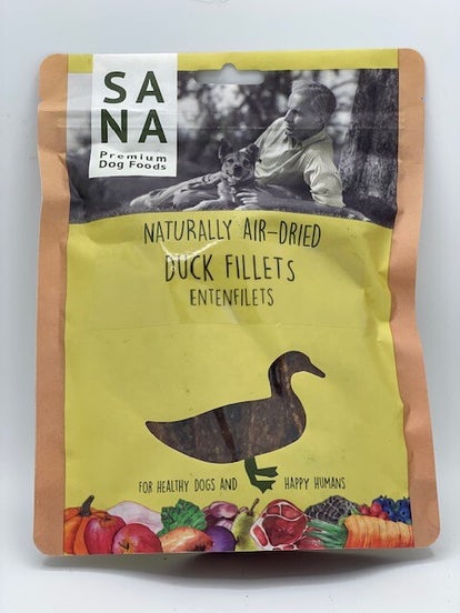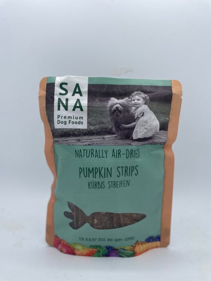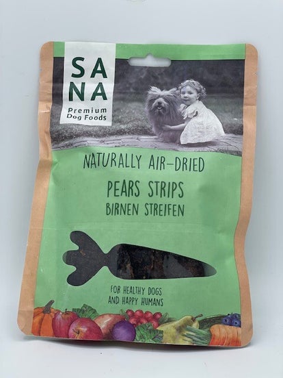 Gedroogde vlees, groenten en fruit strips van Sanadog. 100% natuurlijk.